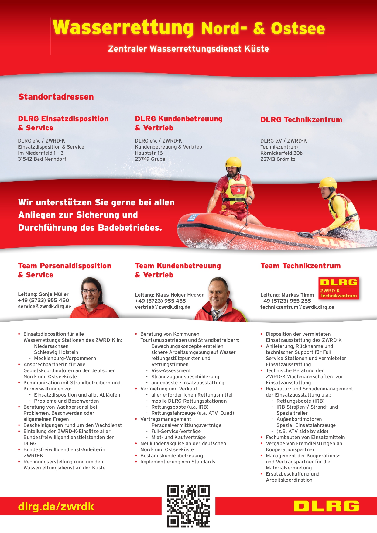 Vermietung und Verkauf aller Rettungsmittel (incl. DLRG-Materialstelle und DSG) , Verträge aller Art sowie Begutachtung von Badestellen.